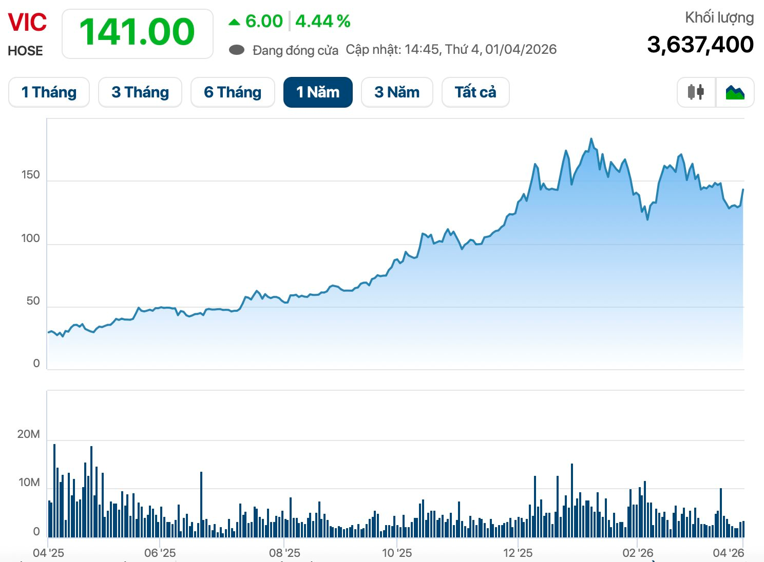 Trên thị trường, cổ phiếu VIC hiện đang dừng ở mức 141.000 đồng/cp, giảm 17% từ đầu năm 2026. Tuy nhiên, Vingroup vẫn vững vàng ở vị trí số 1 toàn sàn chứng khoán, với giá trị vốn hóa lên đến gần 1,1 triệu tỷ đồng.