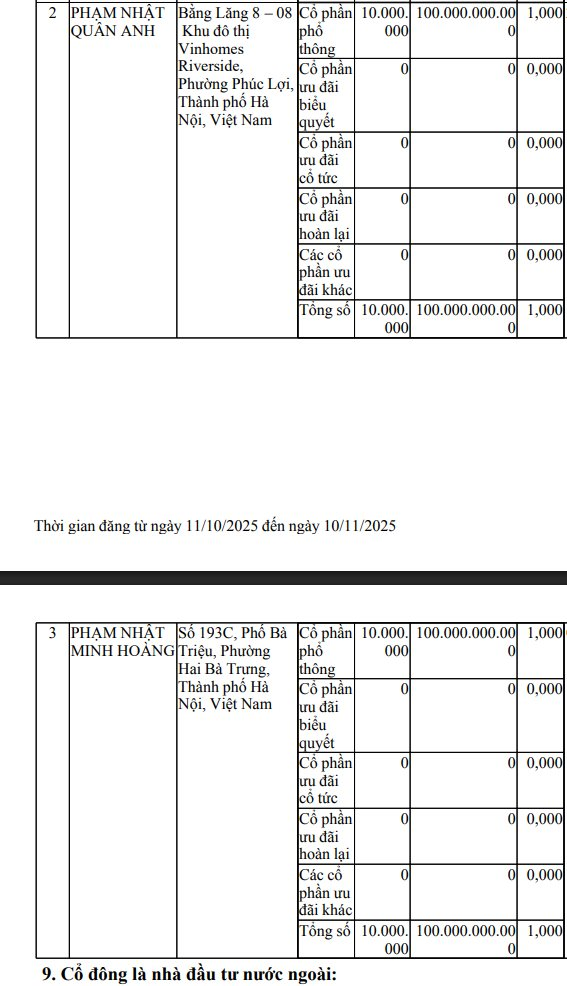 2 người còn lại nắm giữ 1% mỗi người, tức là tổng 2%. Đó là Phạm Nhật Quân Anh và Phạm Nhật Minh Hoàng, đều là 2 con trai của tỷ phú Phạm Nhật Vượng.
