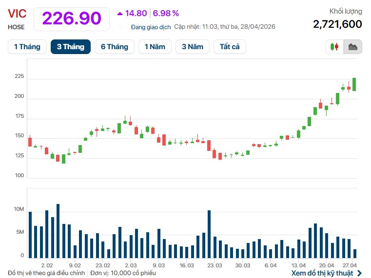 Phiên sáng 28/4, cổ phiếu VIC tiếp tục tăng trần lên mức 226.900 đồng/cp. Vốn hoá đạt trên 63,46 tỷ USD.