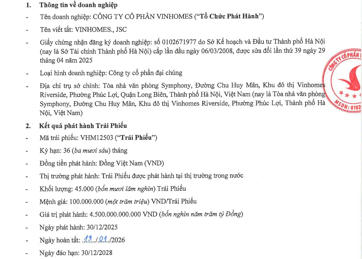 Từ cuối tháng 12/2025, Vinhomes đã có văn bản công bố thông tin bất thường liên quan đến dự kiến phát hành 4.500 tỷ đồng trái phiếu. Trong đó, Tài sản bảo đảm là tài sản thuộc sở hữu hợp pháp của Tập đoàn Vingroup - Công ty CP và/hoặc Vinhomes và/hoặc bên thứ ba.