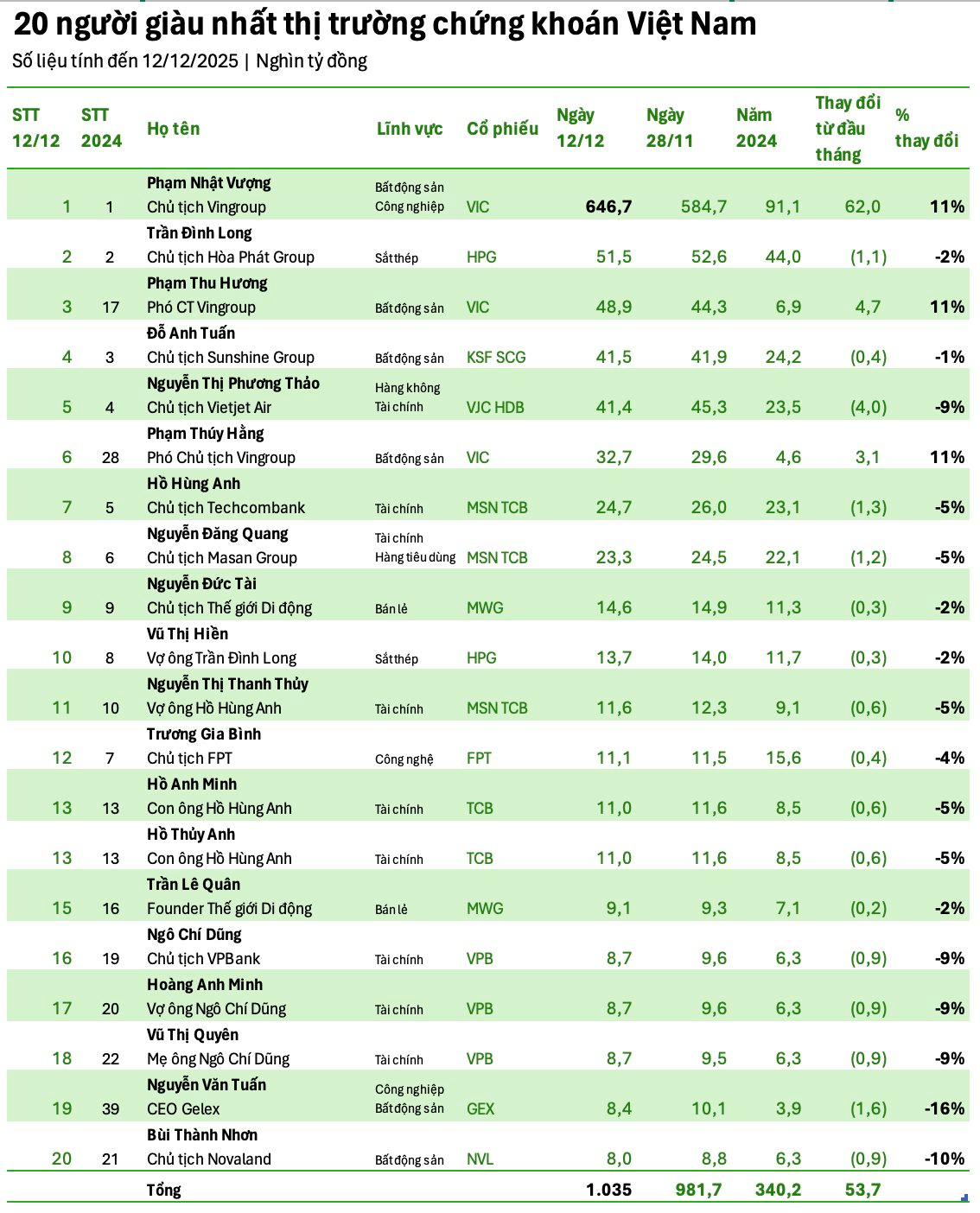 Tính đến ngày 12/12/2025, tổng giá trị tài sản của Top 20 người giàu nhất sàn chứng khoán Việt Nam đạt hơn 1 triệu tỷ đồng, tăng hơn 53.700 tỷ đồng so với cuối tháng 11 và chủ yếu đến từ nhóm cổ phiếu VIC.