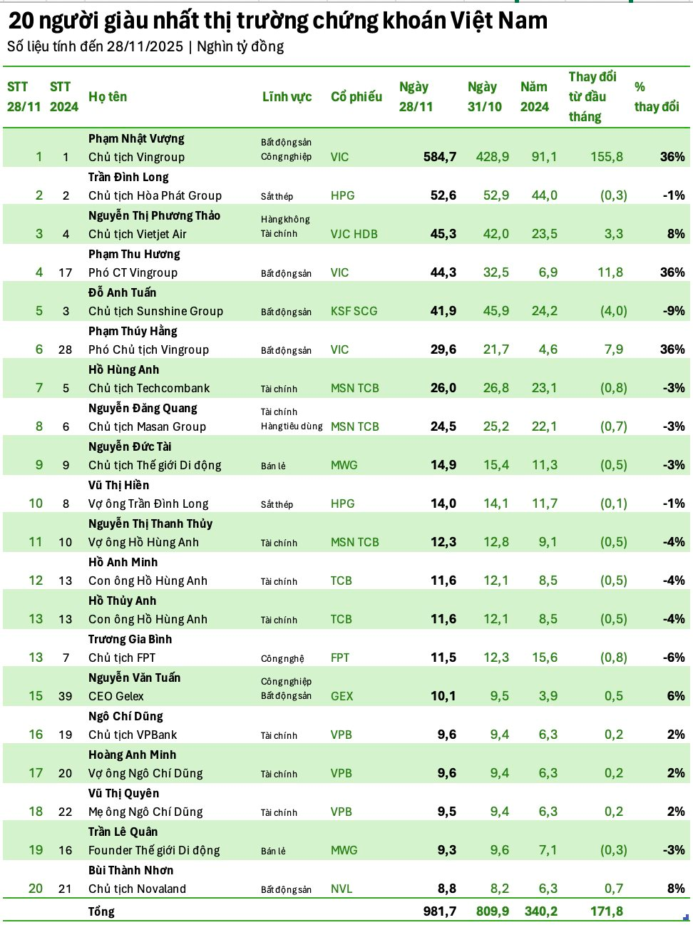 Tính đến ngày 28/11/2025, tổng tài sản của 20 người giàu nhất trên thị trường chứng khoán Việt Nam đạt 981.700 tỷ đồng, tăng 171.800 tỷ đồng so với đầu tháng, tương ứng mức tăng khoảng 21,2%. So với đầu năm 2025, tổng tài sản Top 20 đã tăng tới 641.500 tỷ đồng, tương đương gần 188,6%.
