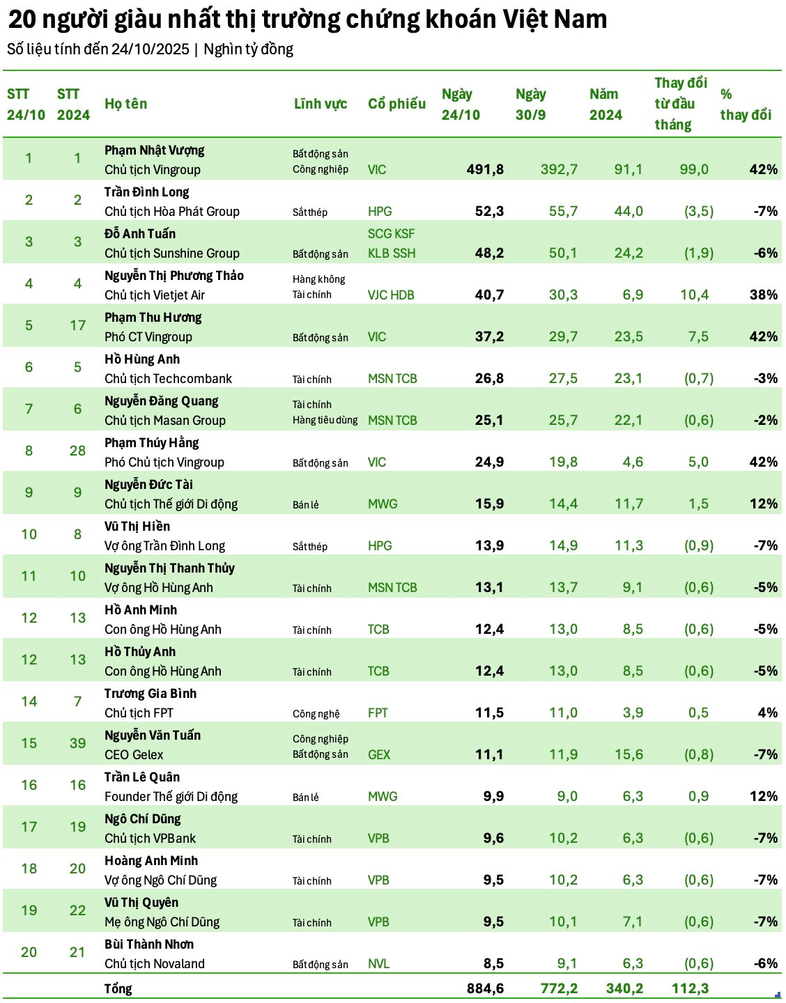 Tính đến ngày 24/10/2025, tổng tài sản của 20 người giàu nhất thị trường chứng khoán Việt Nam đạt 884.600 tỷ đồng, tăng 112.300 tỷ đồng so với đầu tháng và tăng 340.200 tỷ đồng so với đầu năm.
