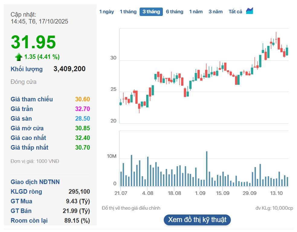 Kết phiên giao dịch ngày 17/10/2025, giá cổ phiếu ANV đóng cửa ở mức 31.950 đồng/cổ phiếu, tăng 4%. Tính từ ngày đầu năm 2025, mã chứng khoán này đã tăng khoảng 61% giá trị.