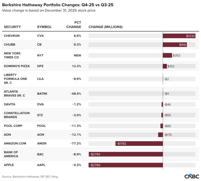 Cổ phiếu Chevron ghi nhận mức tăng trưởng mạnh nhất trong danh mục quý 4 khi Berkshire chi thêm khoảng 1,2 tỷ USD để tăng 6,6% tỷ trọng nắm giữ. Nhờ giá dầu thô leo thang, giá trị cổ phiếu Chevron đã tăng hơn 20% kể từ đầu năm, đưa tổng giá trị khoản đầu tư lên mức gần 24 tỷ USD. Hiện tại, gã khổng lồ dầu khí này vững vàng ở vị trí thứ 5 trong danh mục của Berkshire.