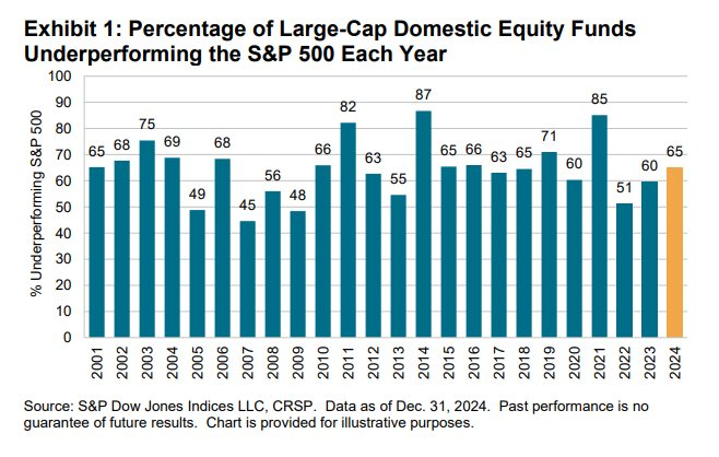 Theo báo cáo SPIVA năm 2024 của S&P Dow Jones Indices, 65% quỹ chủ động đầu tư vào cổ phiếu Mỹ có kết quả kém hơn mức bình quân của chỉ số S&P 500. Nếu kéo dài thời gian ra 10 năm, tỷ lệ này thậm chí cao hơn 80%. Điều đó có nghĩa là phần lớn các "chuyên gia" mà giới đầu tư trả phí cao để nghe lời khuyên thực tế lại làm kém hơn mức trung bình của thị trường.