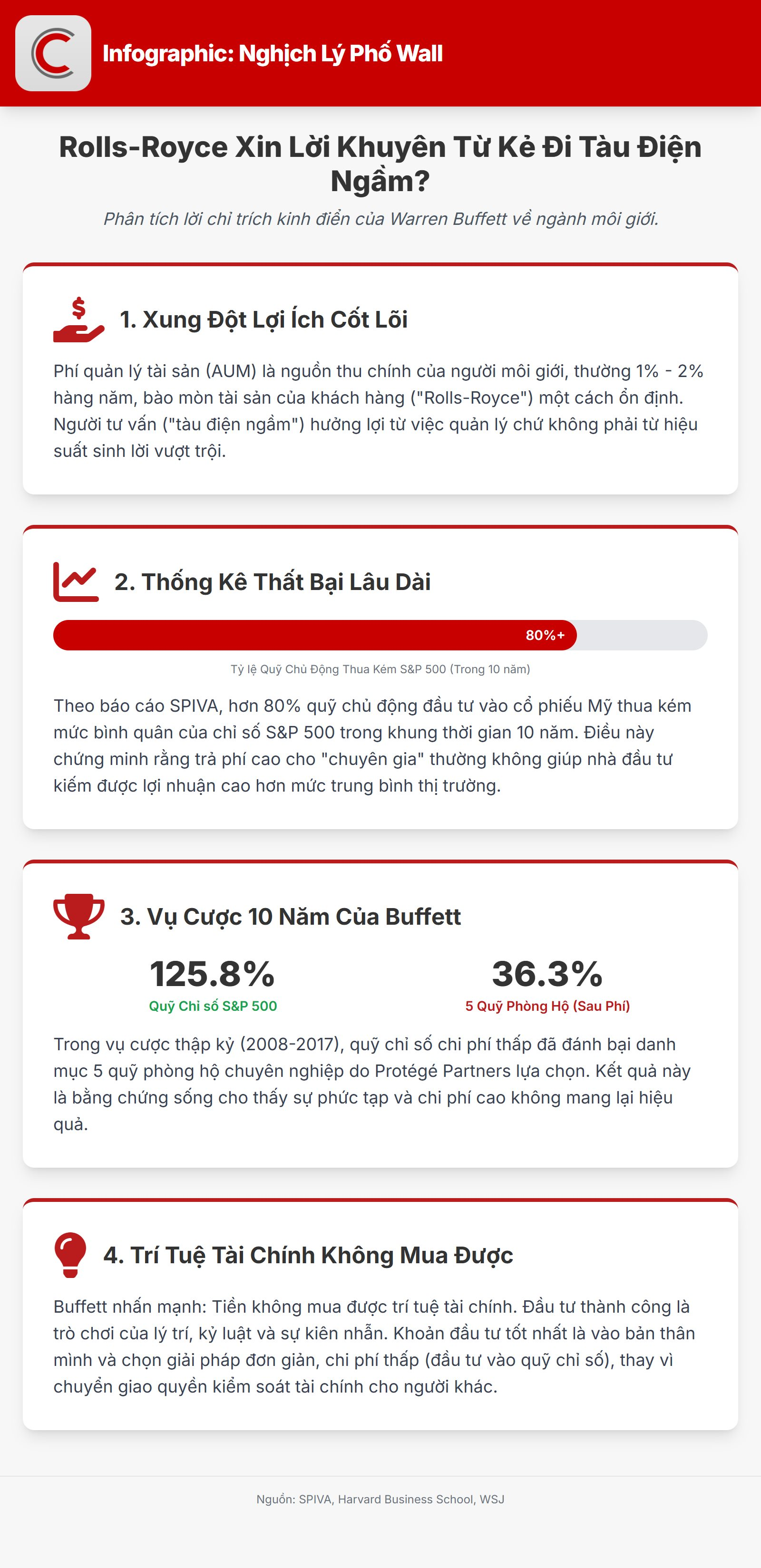 Bản chất của ngành tư vấn tài chính là tạo ra một sự bất đối xứng lợi ích. Những người giàu đi Rolls-Royce bị bào mòn dần tài sản bởi phí quản lý tài sản (AUM), thường dao động quanh mức 1% đến 2% mỗi năm. Người môi giới (người đi tàu điện ngầm) sống tốt, không phải nhờ vào việc giúp khách hàng giàu hơn đáng kể so với thị trường, mà nhờ vào việc thu phí cố định trên khối tài sản đó. Họ hưởng lợi từ việc quản lý tài sản chứ không phải từ hiệu suất sinh lời vượt trội.
