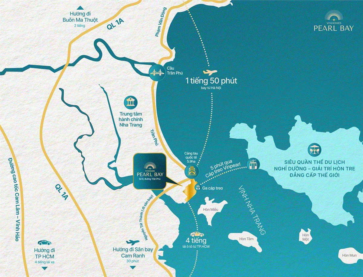 Từ Vinhomes Pearl Bay, cư dân cũng chỉ mất khoảng 30 phút để đến sân bay quốc tế Cam Ranh, nơi đang khai thác hàng chục đường bay thẳng đến Seoul, Bangkok, Singapore và nhiều thành phố lớn ở Trung Quốc, bên cạnh các chặng nội địa trọng điểm như Hà Nội, TP.HCM, Đà Nẵng. Cư dân cũng dễ dàng kết nối với QL1A - trục đường bộ huyết mạch xuyên suốt từ Hà Nội đến Cà Mau; cao tốc Cam Lâm - Vĩnh Hảo, mở ra trục kết nối tốc độ cao về phía Nam, rút ngắn đáng kể thời gian di chuyển đến Bình Thuận, Phan Thiết và TP.HCM.