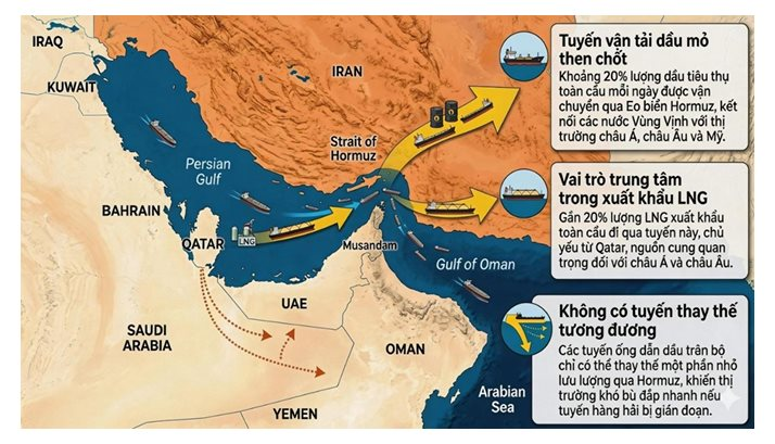 Bên cạnh dầu thô, gần 20% lượng khí tự nhiên hóa lỏng (LNG) xuất khẩu toàn cầu cũng đi qua tuyến này, với nguồn cung chủ yếu từ Qatar.
