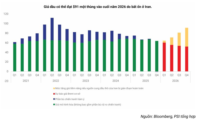 Căng thẳng địa chính trị lập tức phản ánh vào thị trường năng lượng khi giá dầu vọt lên mốc 82 USD/thùng. PSI xây dựng các kịch bản dự phóng cho thấy giá dầu có thể tiến sát hoặc vượt mốc 100 USD/thùng nếu nguồn cung từ Trung Đông bị gián đoạn nghiêm trọng.