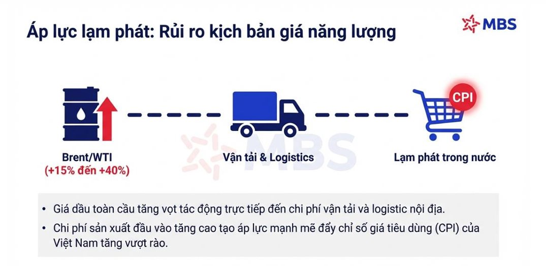 Bên cạnh bài toán vận tải và xuất khẩu, đà tăng của giá năng lượng đang tạo ra sức ép lạm phát chi phí đẩy lên toàn bộ nền kinh tế. Báo cáo đánh giá rủi ro vĩ mô của Chứng khoán MBS dự phóng kịch bản giá dầu thô Brent và WTI có thể ghi nhận mức tăng từ 15% đến 40%, đẩy mặt bằng giá vượt mốc 100 USD/thùng.